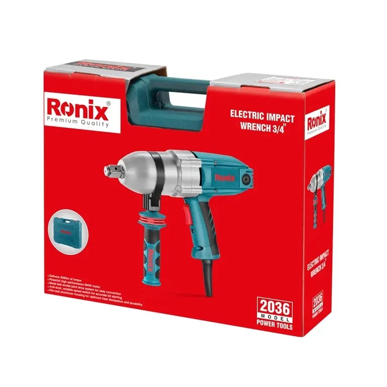 بکس برقی رونیکس 3/4 اینچ مدل 2036 ویژگی های محصول مجهز به موتور پرقدرت 600 وات متشکل از آرمیچر و بالشتک صنعتی مجهز به سیستم کلاچ و گیربکس پرقدرت جهت کاربریهای صنعتی و مداوم دارای بیشترین گشتاور به هنگام ضربه زدن و در عین حال انتقال کمترین میزان ضربه ارائه گشتاور500 نیوتن متری برای باز و بسته کردن سریع انواع پیچها استفاده از بلبرینگ های جهت جلوگیری از استهلاک زودرس و بالا بردن عمر بدنه آلومینیومی ریخته گری شده برای افزایش دوام دستگاه سوییچ ضد گرد و غبار با قابلیت تنظیم سرعت