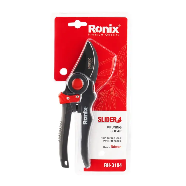 قیچی باغبانی اسلایدر رونیکس مدل RH-3104 ابزاری مناسب برای هرس شاخه های نازک درختان، بوته های گل و گیاه و ... می باشد. این ابزار مجهز به تیغه های سخت کاری شده فولاد کربن و مقاوم در برابر زنگ زدگی است که برای برش های آسان و صاف طراحی شده اند. برای این قیچی باغبانی یک فنر مقاوم و در عین حال نرم تعبیه شده که پس از هر برش لبه های قیچی را از هم باز می کند تا خستگی دست کاربر را به حداقل برساند. از دیگر ویژگی های این ابزار باغبانی می توان به برخورداری از دسته ارگونومیک PP + TPR ضد لغزش اشاره کرد که موجب افزایش راحتی کاربر و کاهش خستگی او به هنگام انجام کارهای طولانی مدت می شود. قیچی RH-3104 رونیکس دارای قفل ایمنی بزرگی بوده که ایمنی را در زمان استفاده از ابزار تضمین می کند.