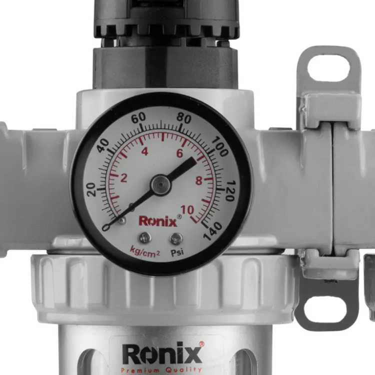 فیلتر و تنظیم کننده هوا یکی از ابزار های بادی پرکاربرد است که وظیفه اصلی آن جذب نا خالصی های موجود در هوا و تنظیم میزان هوای مجاز ورودی است. فیلتر دو قلو رونیکس مدل RH-6902 یکی از محصولات باکیفیت و خوش ساخت شرکت رونیکس است که با بدنه مقاوم و مستحکم، جذب رطوبت هوا و روان کاری خودکار توانسته نظر مصرف کنندگان را به خود جلب نماید. محدوده دمای کاری این محصول بین 5 تا 60 درجه است و حداکثر فشاری که می تواند تحمل کند کوچکتر و یا مساوی با 140 پوند بر اینچ است. لازم به ذکر است که بهترین فشار کاری برای این محصول بین 10 تا 120 پوند بر اینچ می باشد.