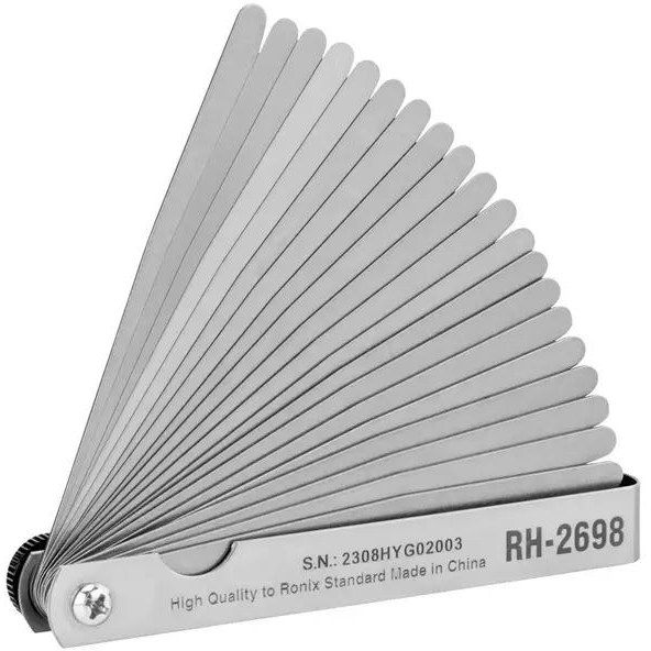 آچار فیلر RH-2698 دارای 20 تیغه با ضخامتهای مختلف است که از جنس استیل ساخته شدهاند. با این ابزار میتوانید براساس واحد متریک و اینچ، فاصلۀ بین دو سطح را اندازهگیری کنید.