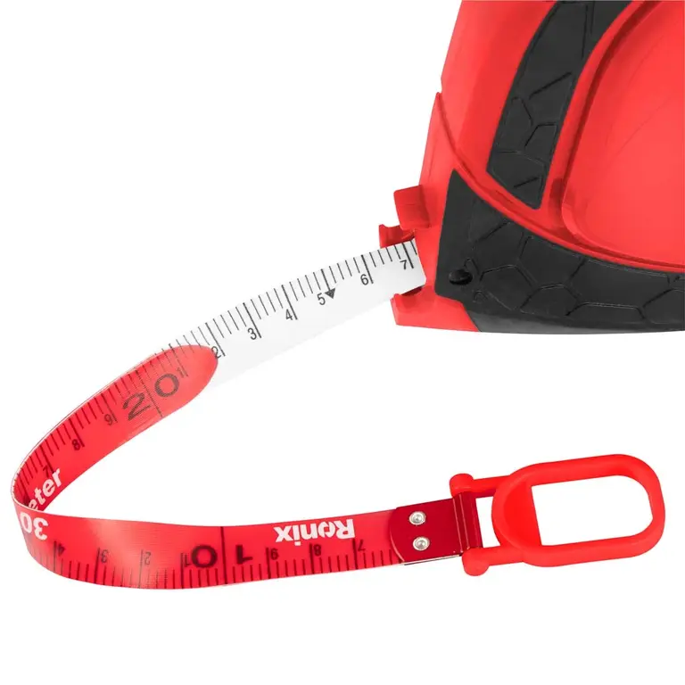 متر RH-9803 رونیکس مجهز به بدنه ای مقاوم در برابر ضربه است. نوار 30 متری این متر از جنس فایبرگلاس است که وزن آن را به طرز چشمگیری کاهش داده است و موجب شده است از مقاومت بالایی برخوردار شود. این متر مجهز به بدنه مقاوم و ضد ضربه است که در برابر آسیب های ناشی از ضربات وارد شده مقاوم است. واحد اندازهگیری طول در این متر برحسب سانتی متر است و در هر دو سمت نوار چاپ شده است. این نوار با روکش PVC به منظور افزایش دوام و نیز قابلیت شستشو پوشیده شده است.