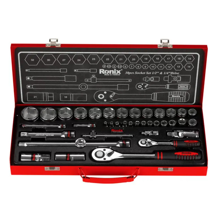 در این مجموعه بکس 38 عددی رونیکس، انواع سوکتها، دسته جغجغههای دو سایز 1/2 اینچ و 1/4 اینچ، لقلقهها، کمکهای کوتاه و بلند، بکس شمع و سهراهی بکس وجود دارد که امکان استفاده از ابزار در زوایا و شرایط مختلف را فراهم میکند. طراحی آینهای سطح سوکتها، علاوه بر زیبایی، از زنگزدگی جلوگیری میکند و ماشینکاری دقیق آنها باعث اتصال راحت، بدون آسیب به پیچ و حداکثر کنترل حین کار میشود.