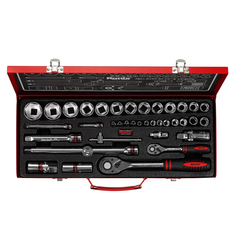 در این مجموعه بکس 38 عددی رونیکس، انواع سوکتها، دسته جغجغههای دو سایز 1/2 اینچ و 1/4 اینچ، لقلقهها، کمکهای کوتاه و بلند، بکس شمع و سهراهی بکس وجود دارد که امکان استفاده از ابزار در زوایا و شرایط مختلف را فراهم میکند. طراحی آینهای سطح سوکتها، علاوه بر زیبایی، از زنگزدگی جلوگیری میکند و ماشینکاری دقیق آنها باعث اتصال راحت، بدون آسیب به پیچ و حداکثر کنترل حین کار میشود.
