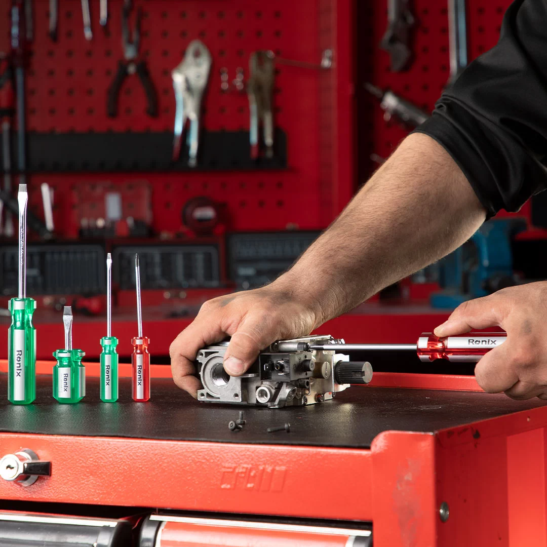 ست 7 عددی پیچ گوشتی ساعتی رونیکس مدل RH-2702 از 4 عدد پیچ گوشتی دوسو و 3 عدد پیچ گوشتی چهارسو تشکیل شده است که همگی دارای سری آهنربایی از جنس استیل و بدنه ای از آلیاژ کروم-وانادیوم سختکاری شده با روکش کروم هستند.